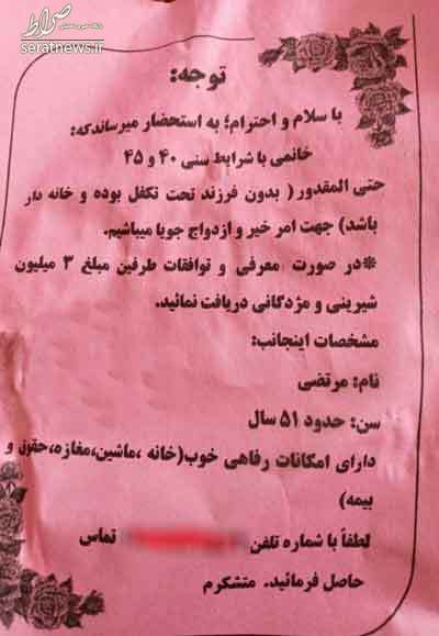 تصویری از یک آگهی همسریابی در شبکههای اجتماعی منتشر شده که در آن فرد متقاضی وعده داده است که در صورت معرفی گزینه مناسب مژدگانی پرداخت خواهد کرد!